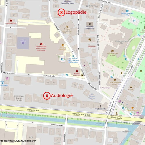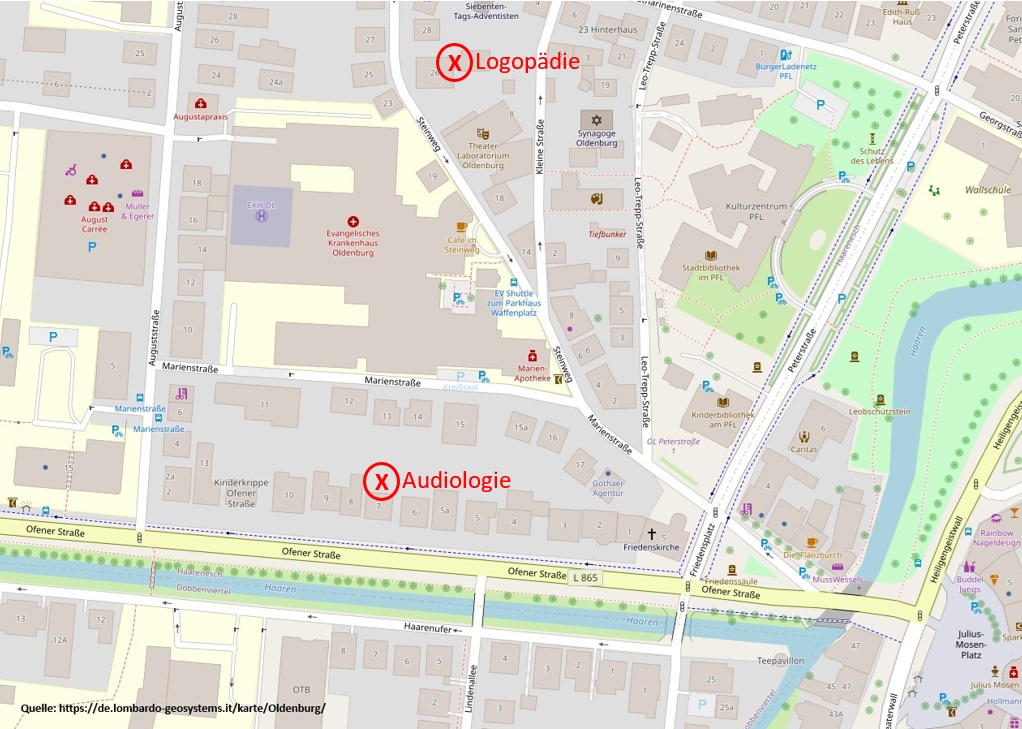 Von dort sind es ca. 180m zu Fuß bis zur Praxis in der Marienstraße 12 (Standort Audiologie) oder 450m bis in den Steinweg 26 (Standort Logopädie).