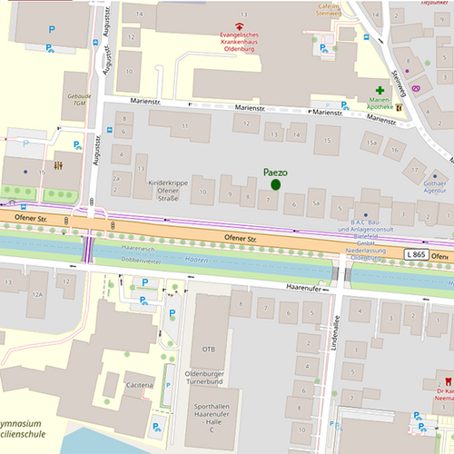 Von dort sind es ca. 250m zu Fuß bis zur Praxis in der Marienstraße 12 (Hintergrundstück).